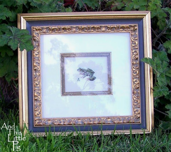 Two wonderful ladies do my framing, and we spent an hour with this little frog who measures all of 2.5 x 1.75 inches. I think we tried every frame in the shop. We had this nice gold frame, but it just wasn't enough, so as a joke, we decided to try this big heavy dark green, gold trimmed frame, it was too much. Then the framers God bless their little hearts thought 'Oh double frame', and put them both together. It worked, we spent more time saying it was ridiculous and too expensive to frame such a small piece in this way. More frames tried, nothing worked. So my Framing Fantasy ended up being 20 x 18 inches, and is absolutely not ridiculous, but Devine.